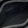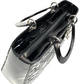 Christian Dior Lady Dior in Black Patent Leather with Cannage Pattern, silver-tone hardware, and flat handles. Features logo jacquard lining & single Interior pocket, zip closure at top and protective feet at base. Includes dust bag.